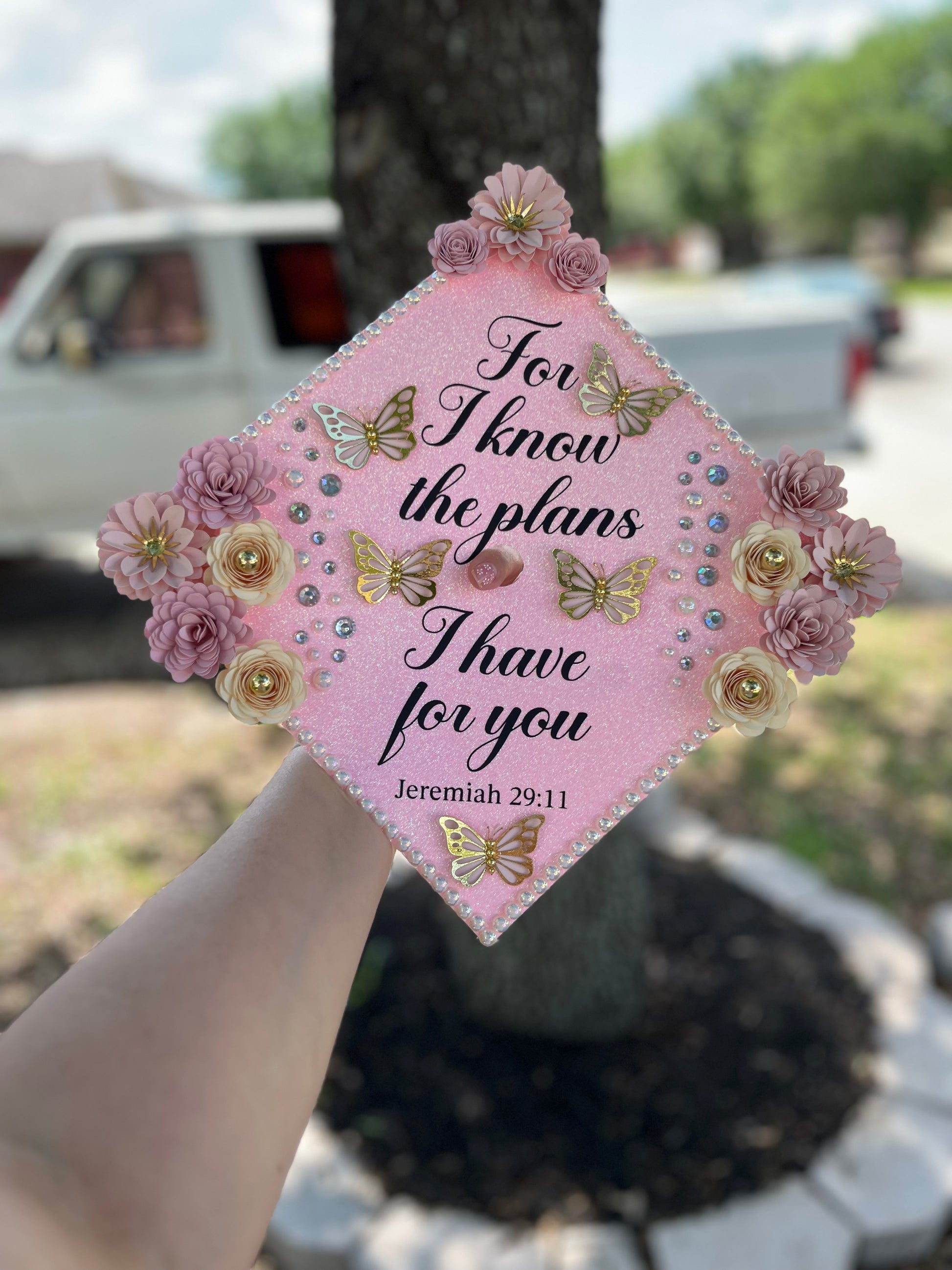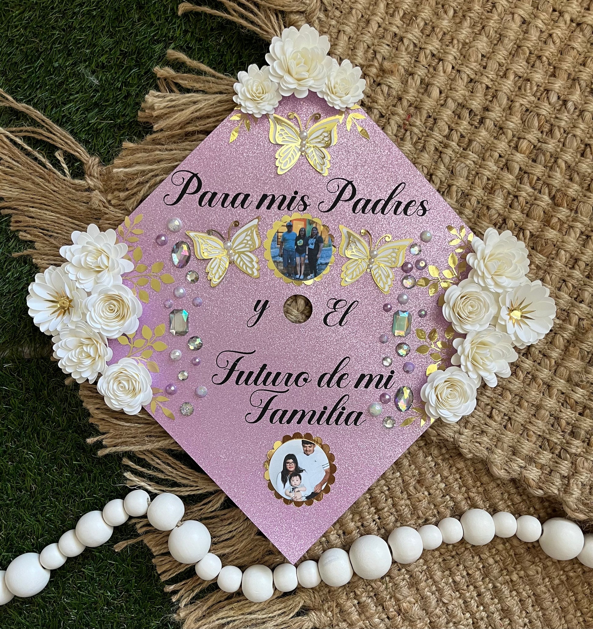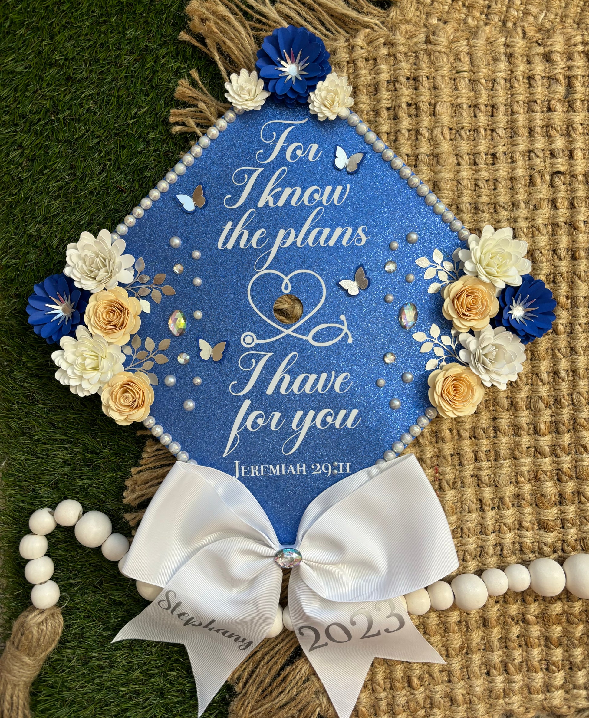 This is the perfect piece to customize your graduation,These topper includes ironed on vinyl and heavy glitter cardstock to insure the best quality for your grad cap topper. The flowers are handmade by me, the flowers are not sold individually and can not be found anywhere else, Making it even more special for your day.