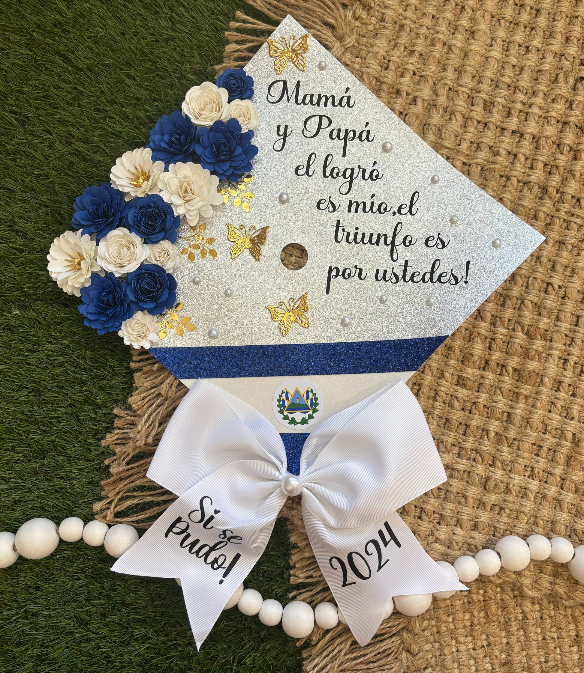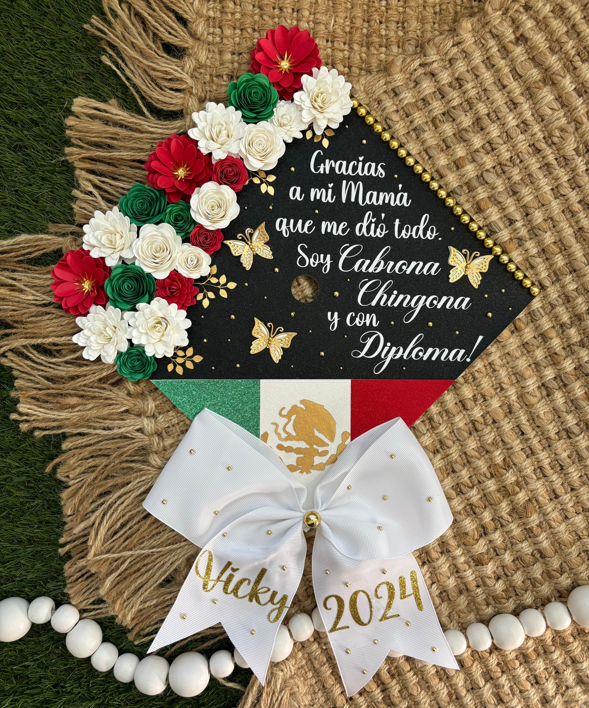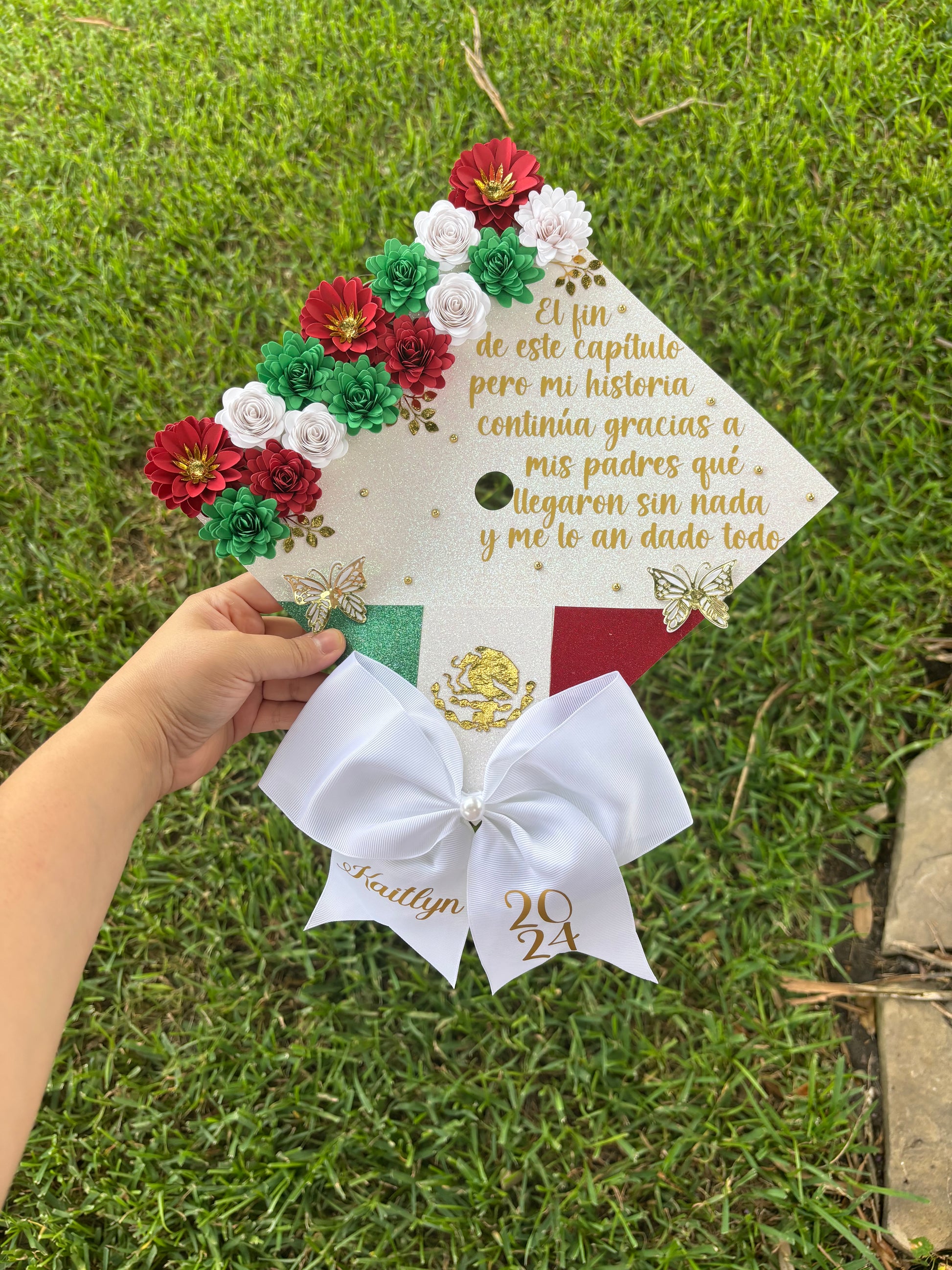 This is the perfect piece to customize your graduation,These topper includes ironed on vinyl and heavy glitter cardstock to insure the best quality for your grad cap topper. The flowers are handmade by me, the flowers are not sold individually and can not be found anywhere else, Making it even more special for your day.