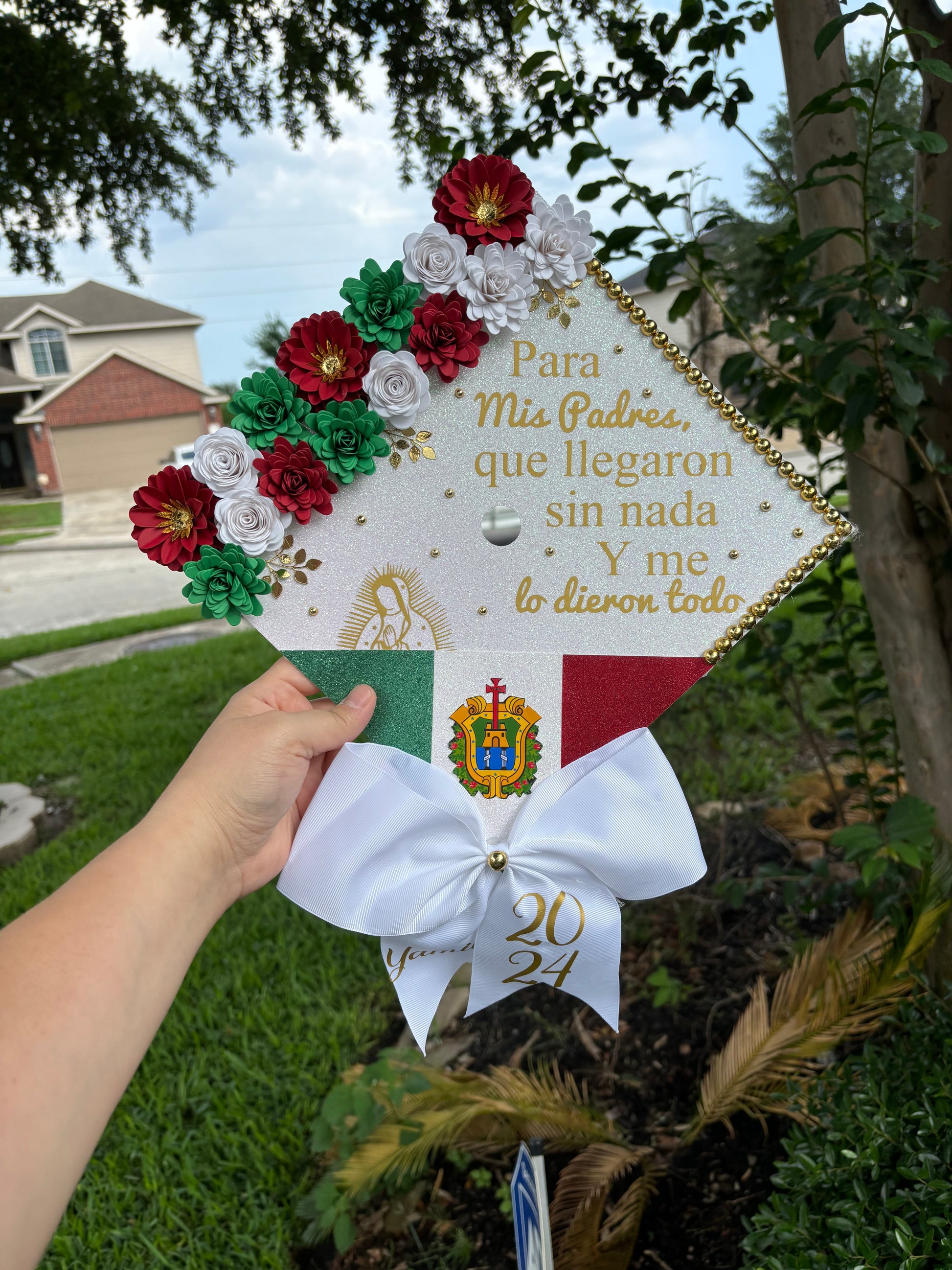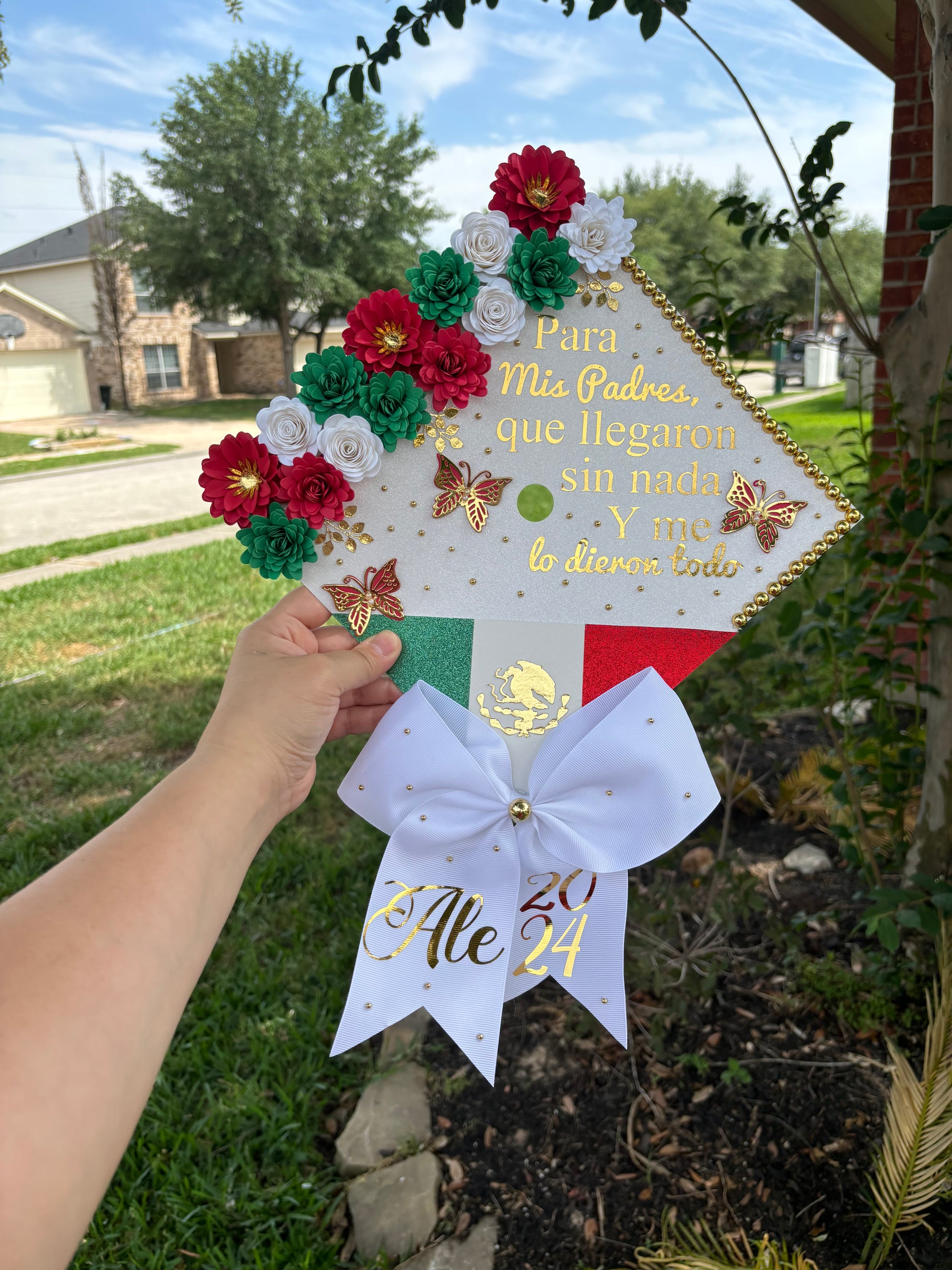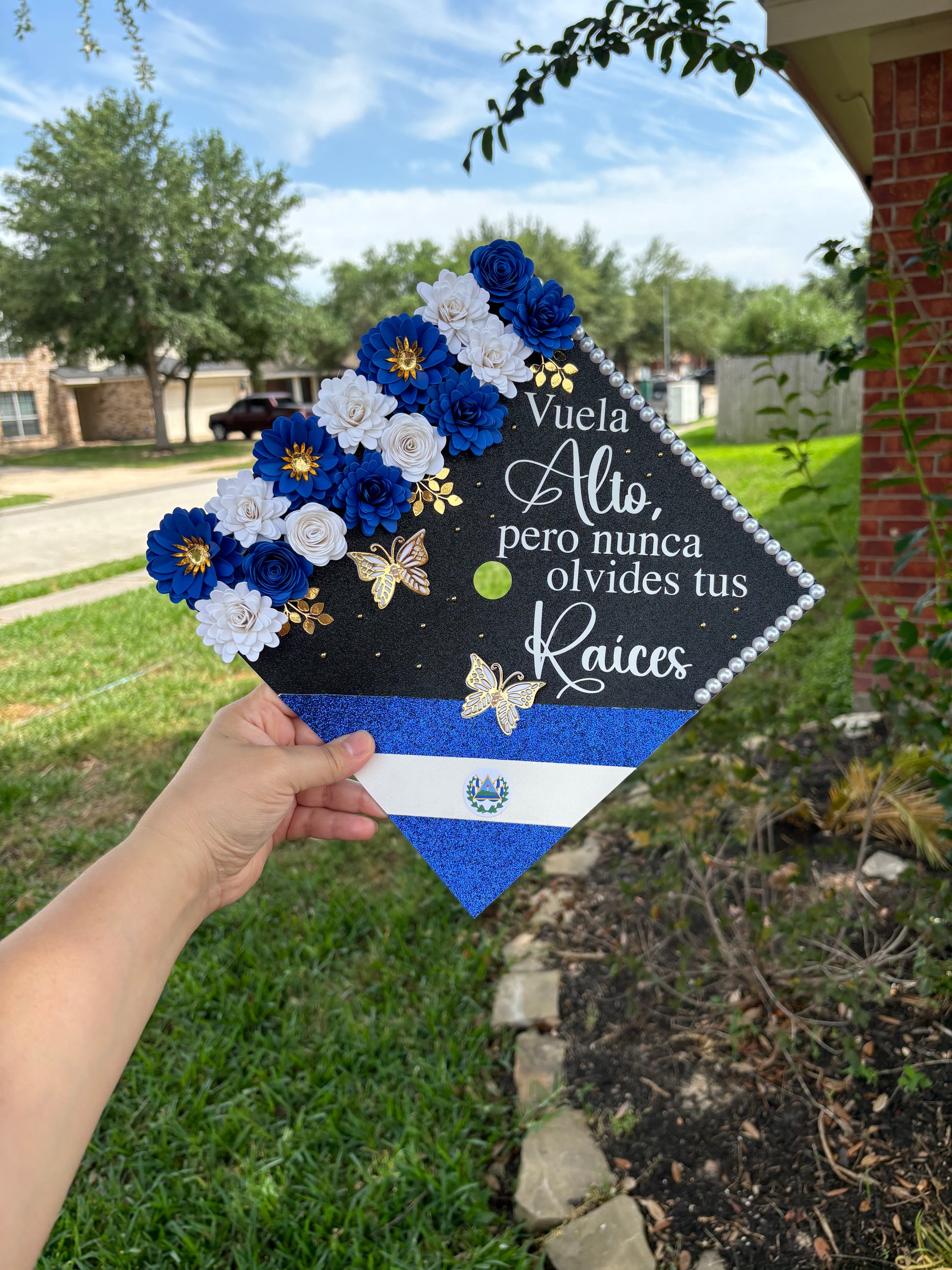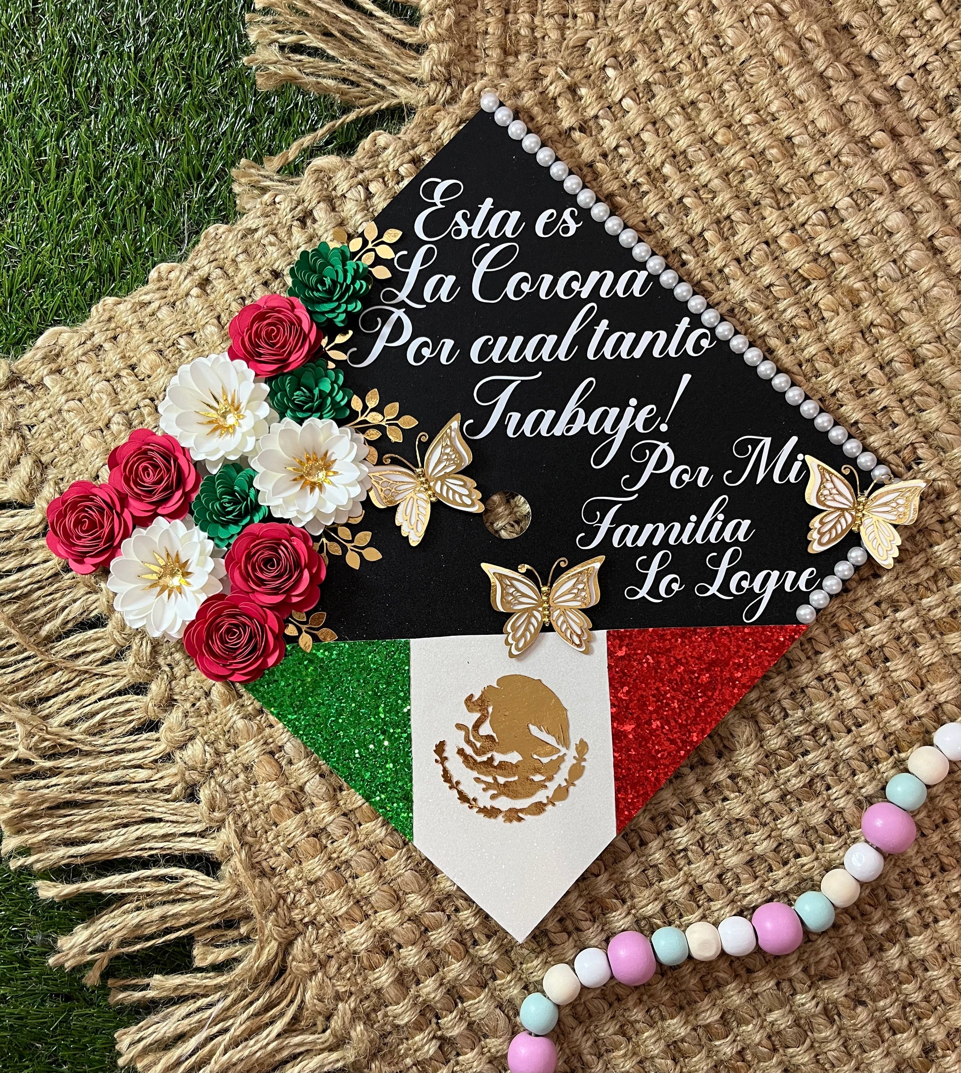 This is the perfect piece to customize your graduation,These topper includes ironed on vinyl and heavy glitter cardstock to insure the best quality for your grad cap topper. The flowers are handmade by me, the flowers are not sold individually and can not be found anywhere else, Making it even more special for your day.