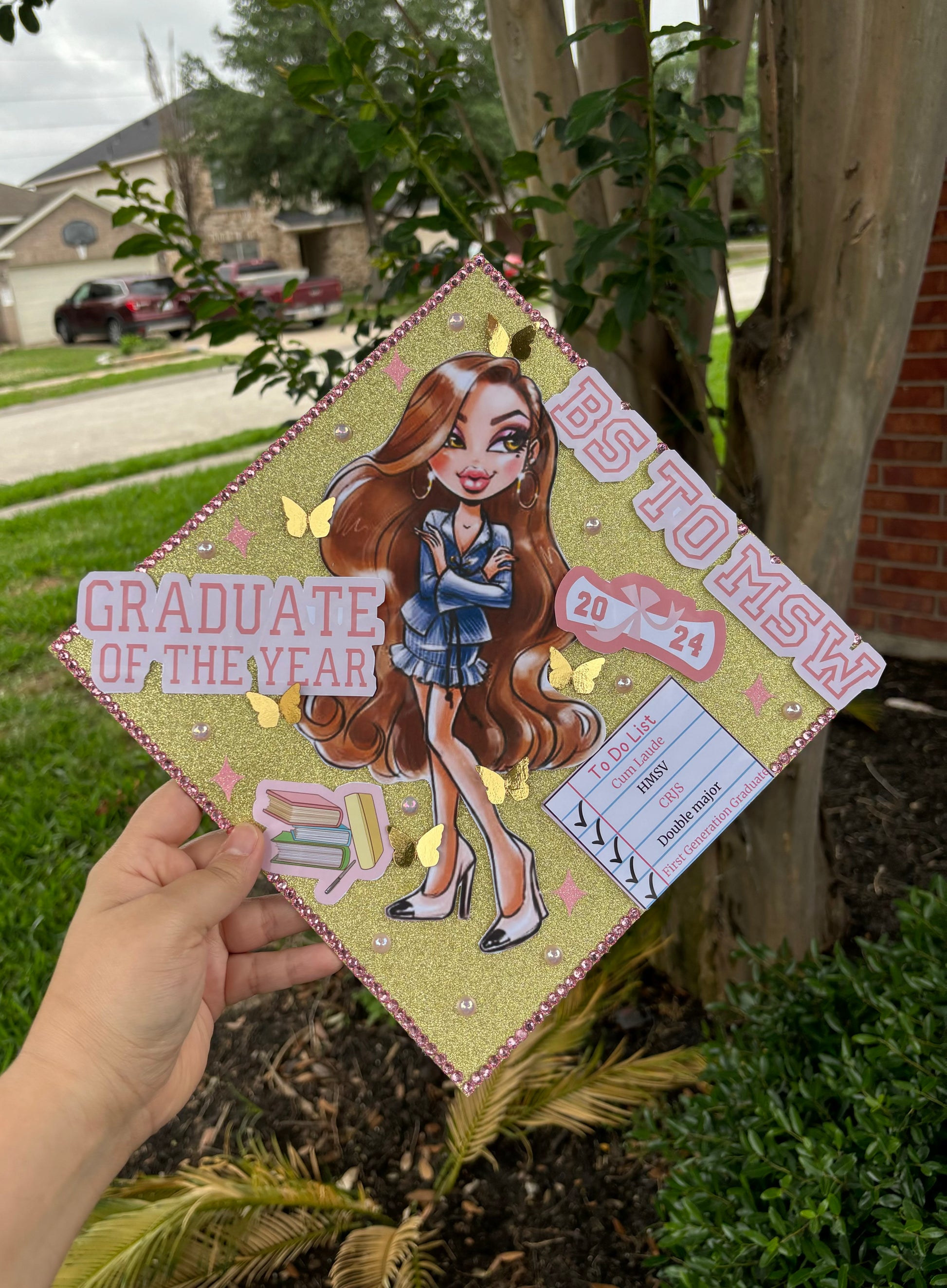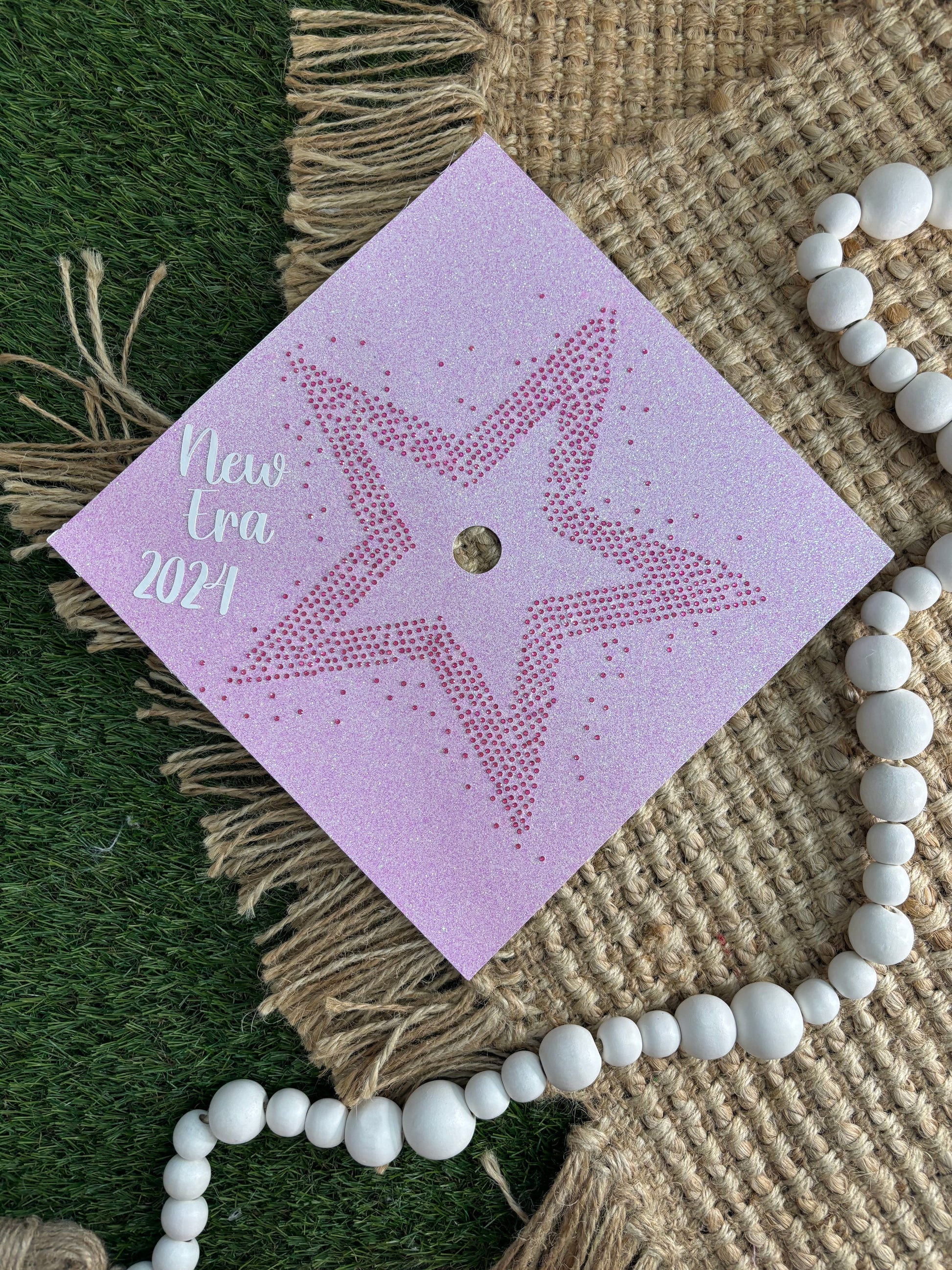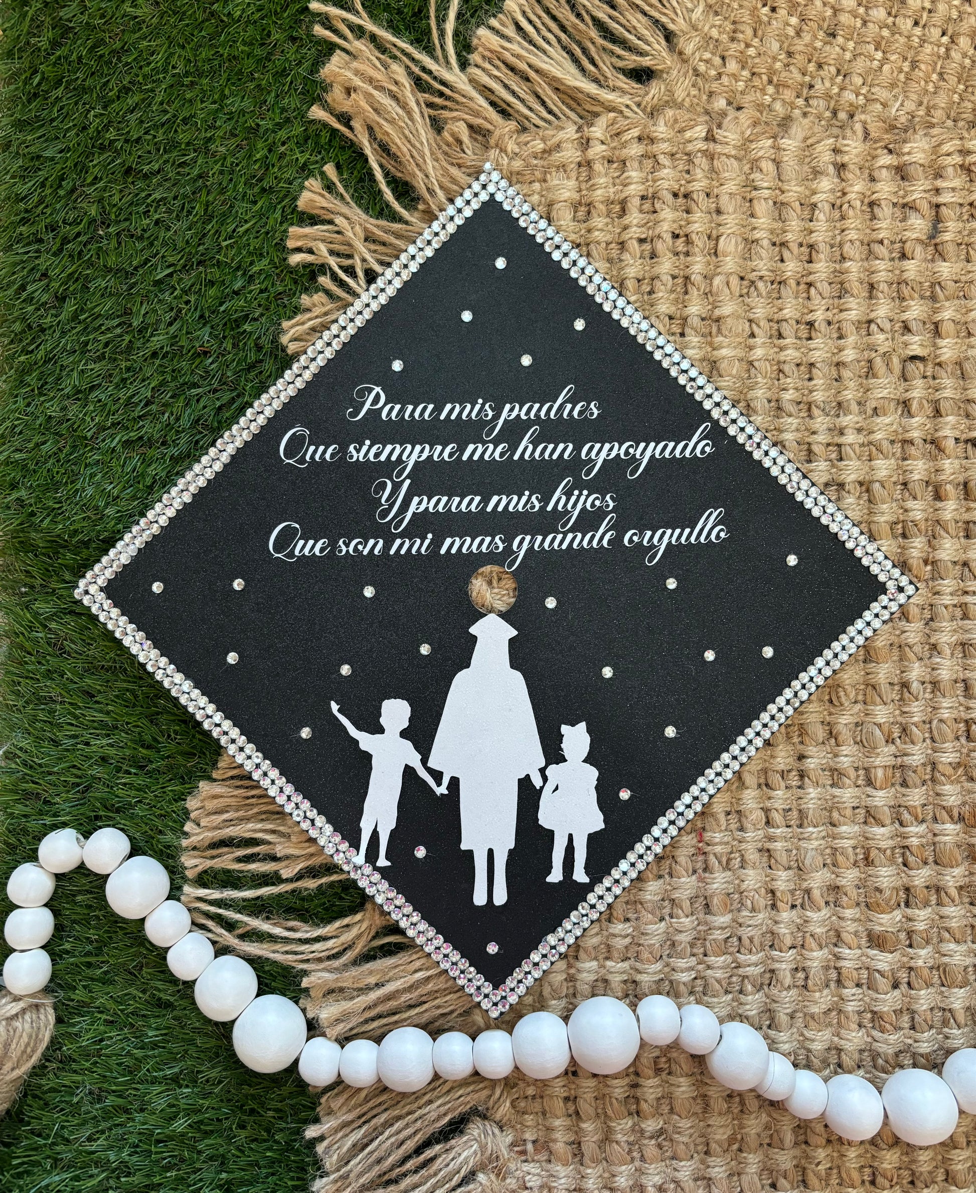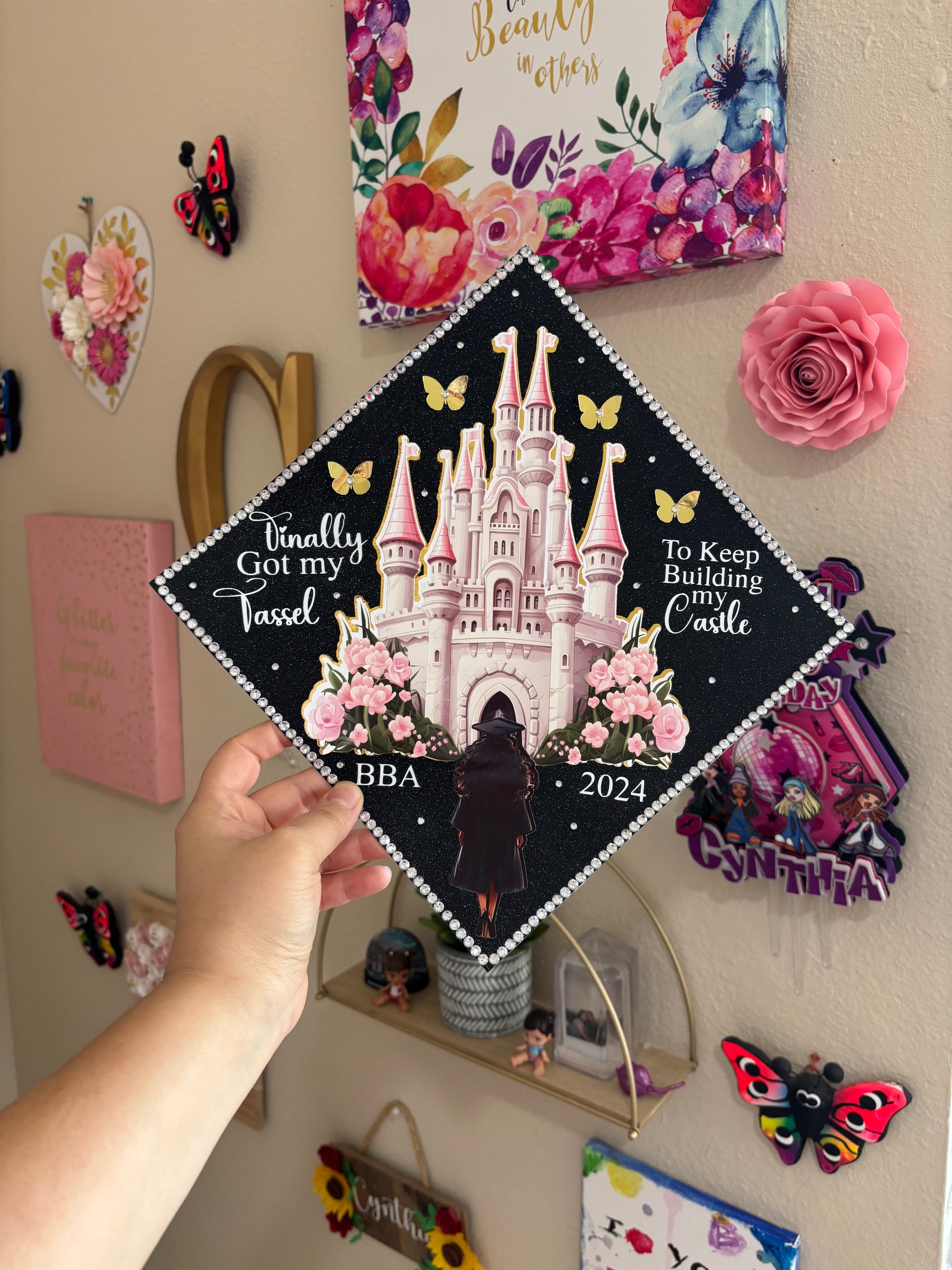 Size of grad cap topper is 9.5x9.5 with a centered hole