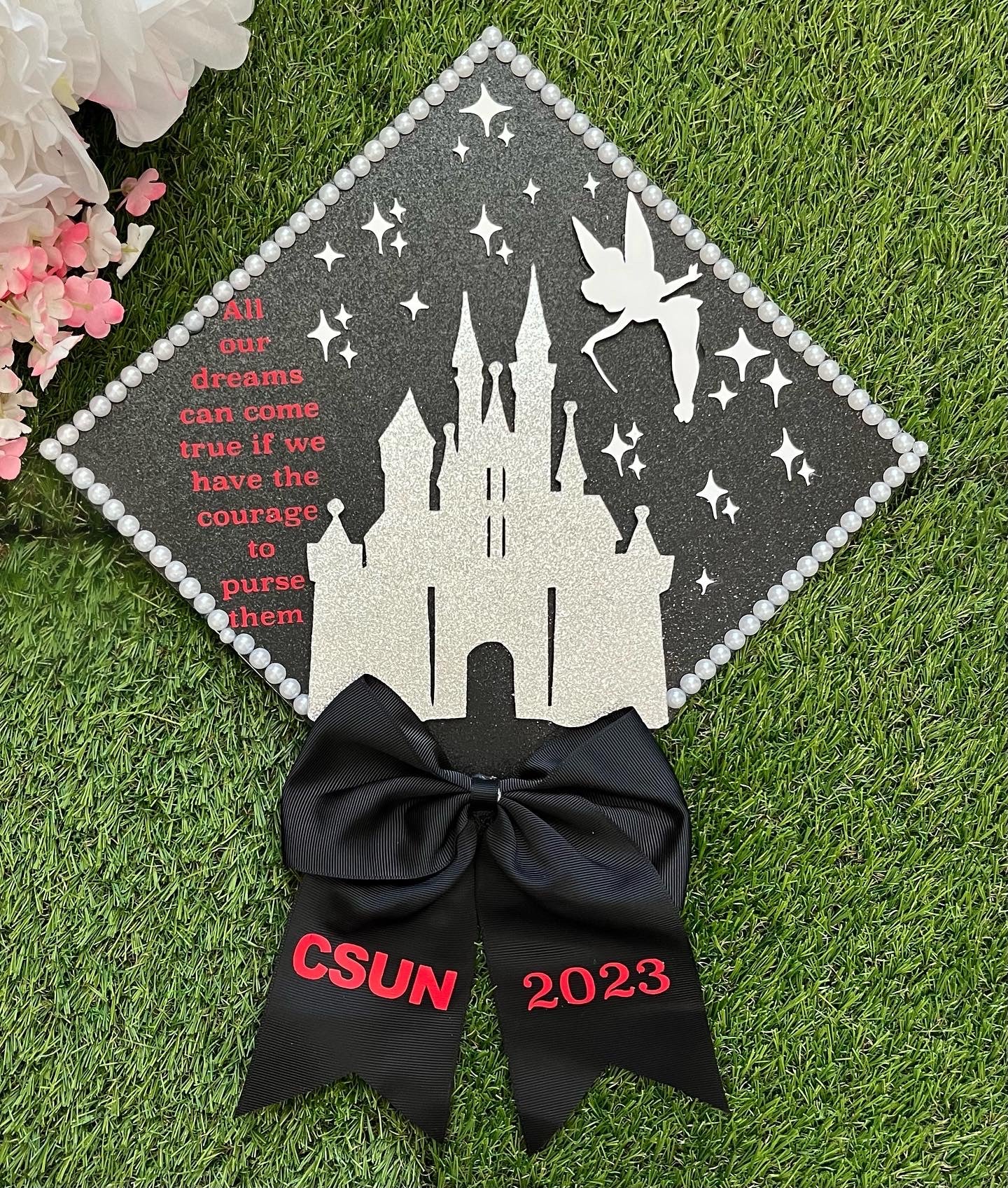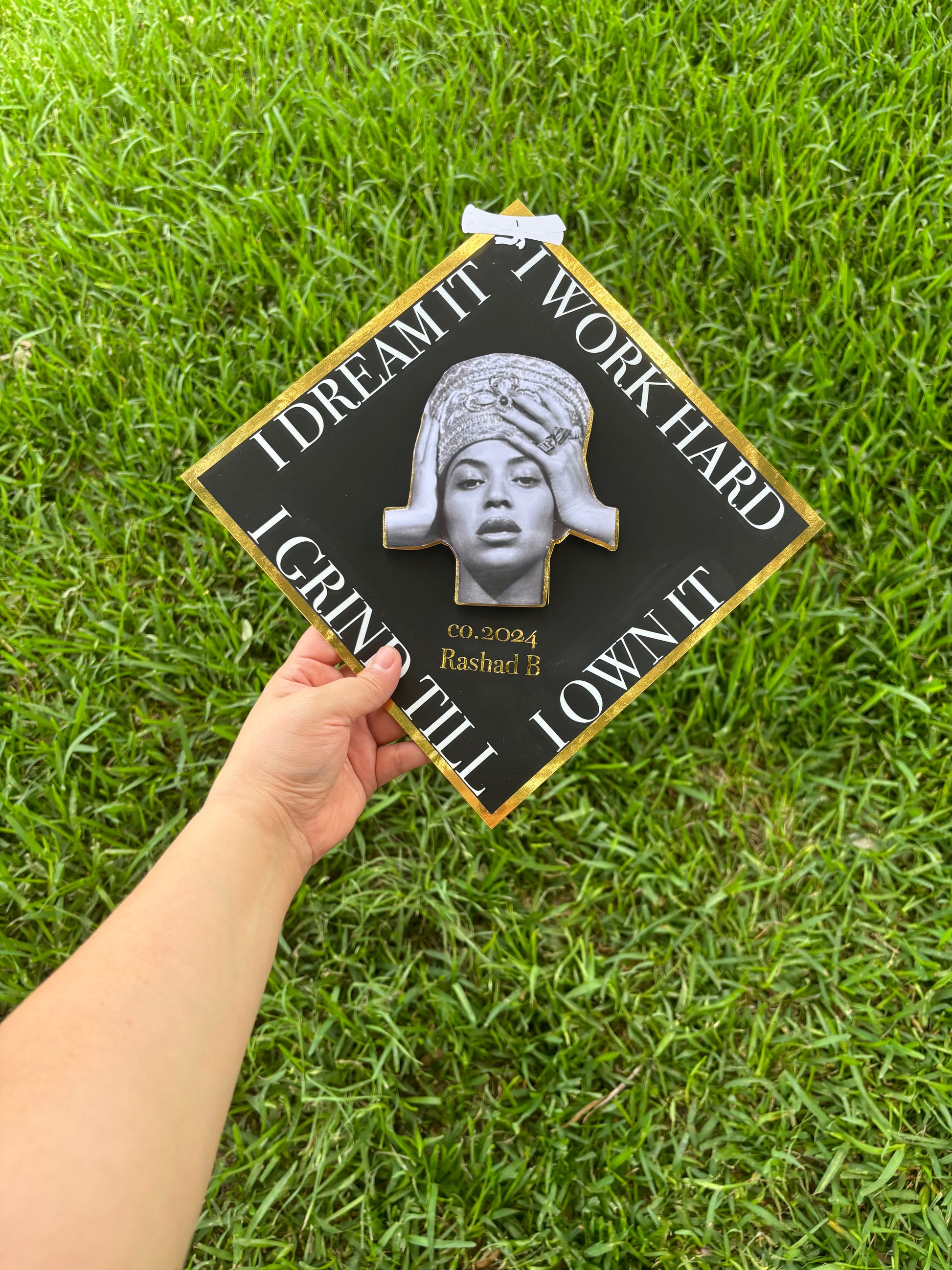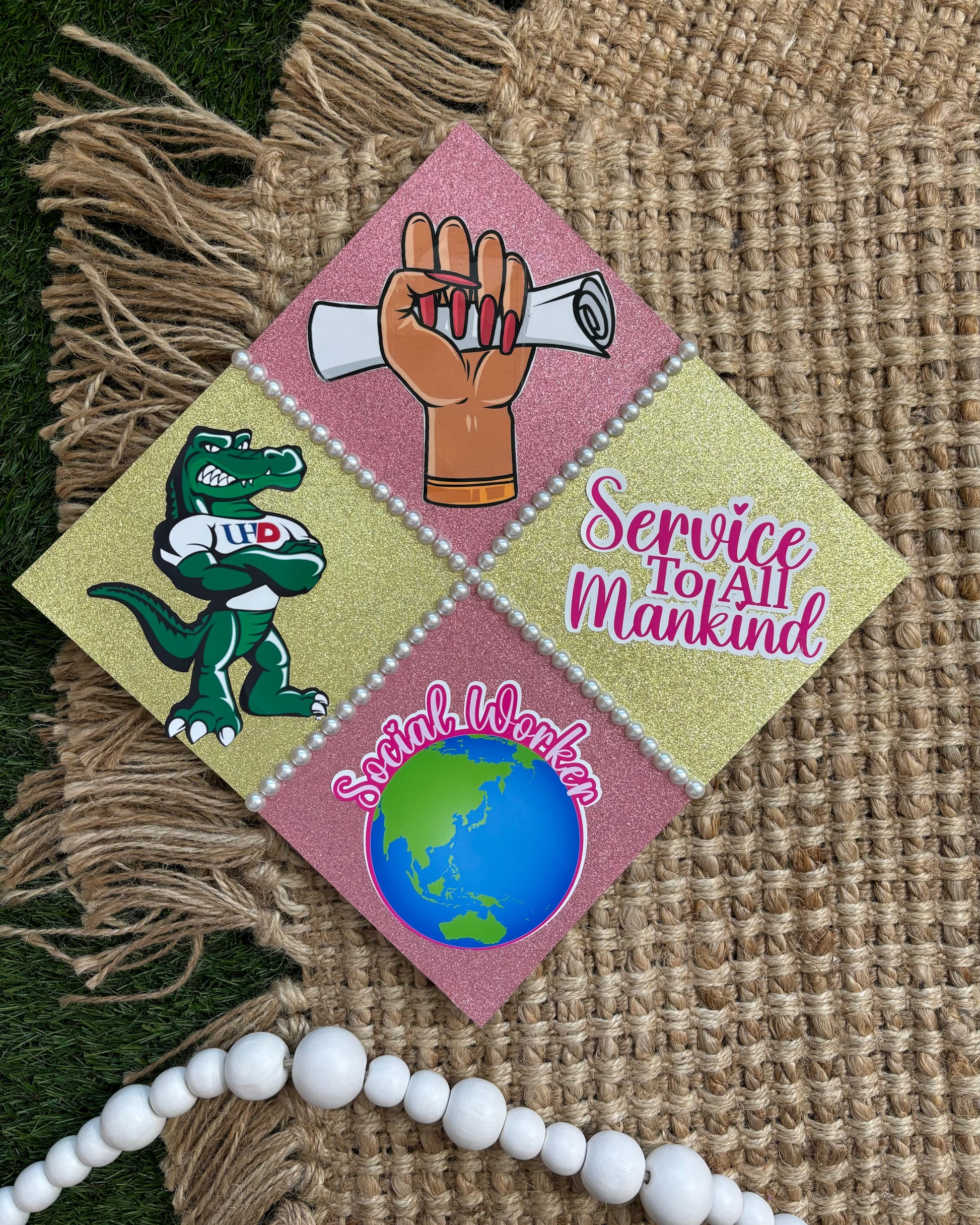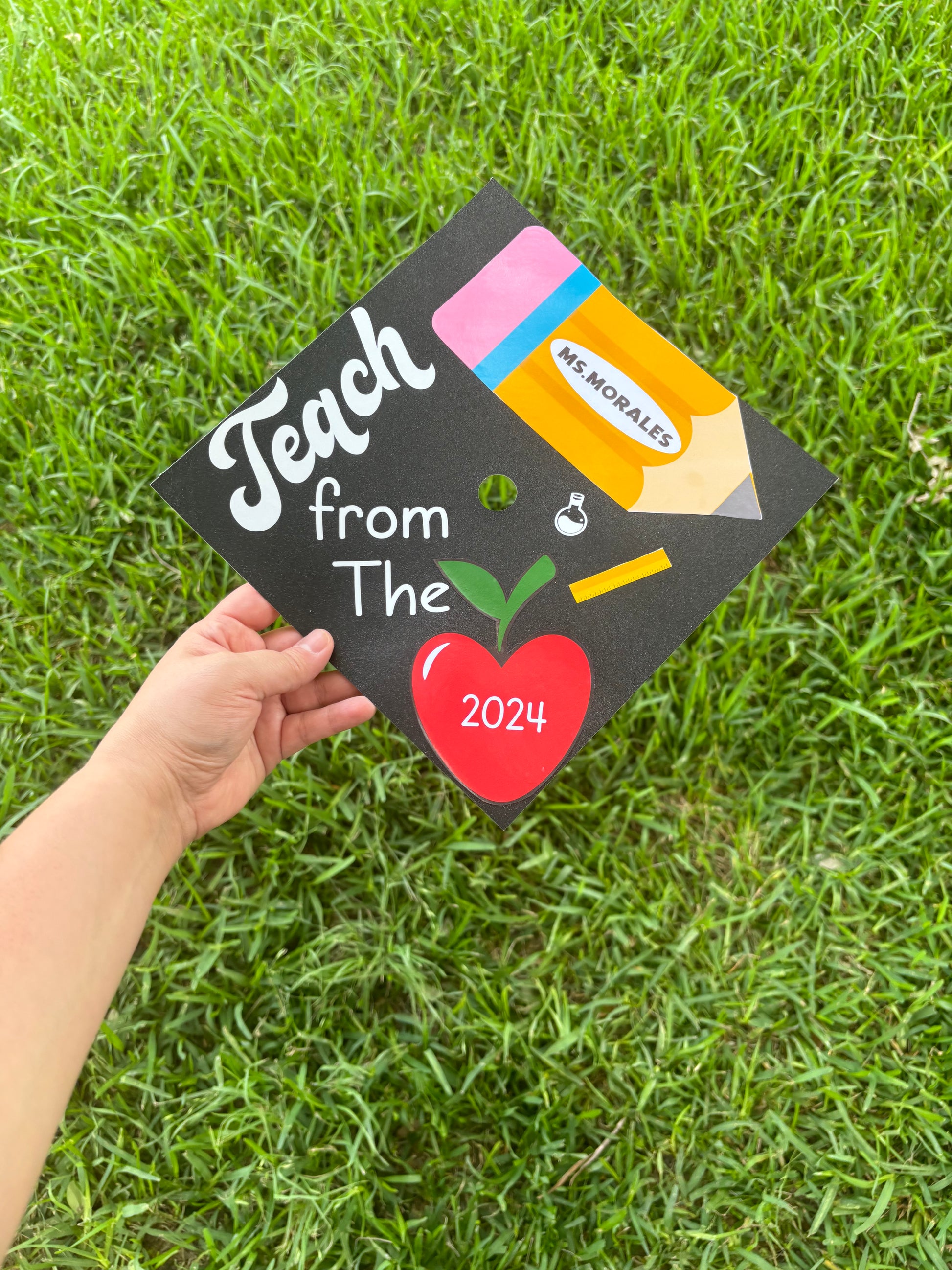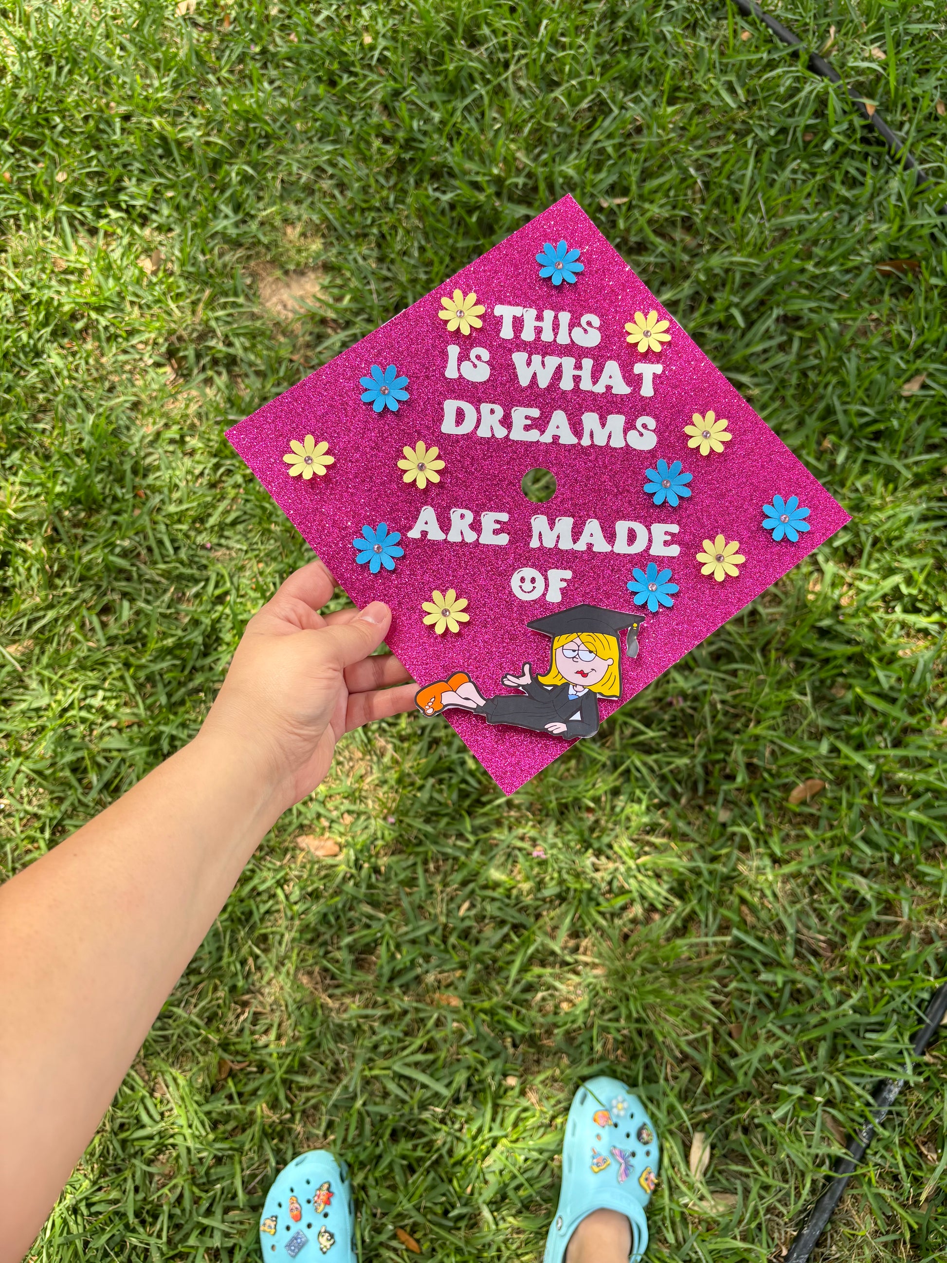 Size of grad cap topper is 9.5x9.5 with a centered hole