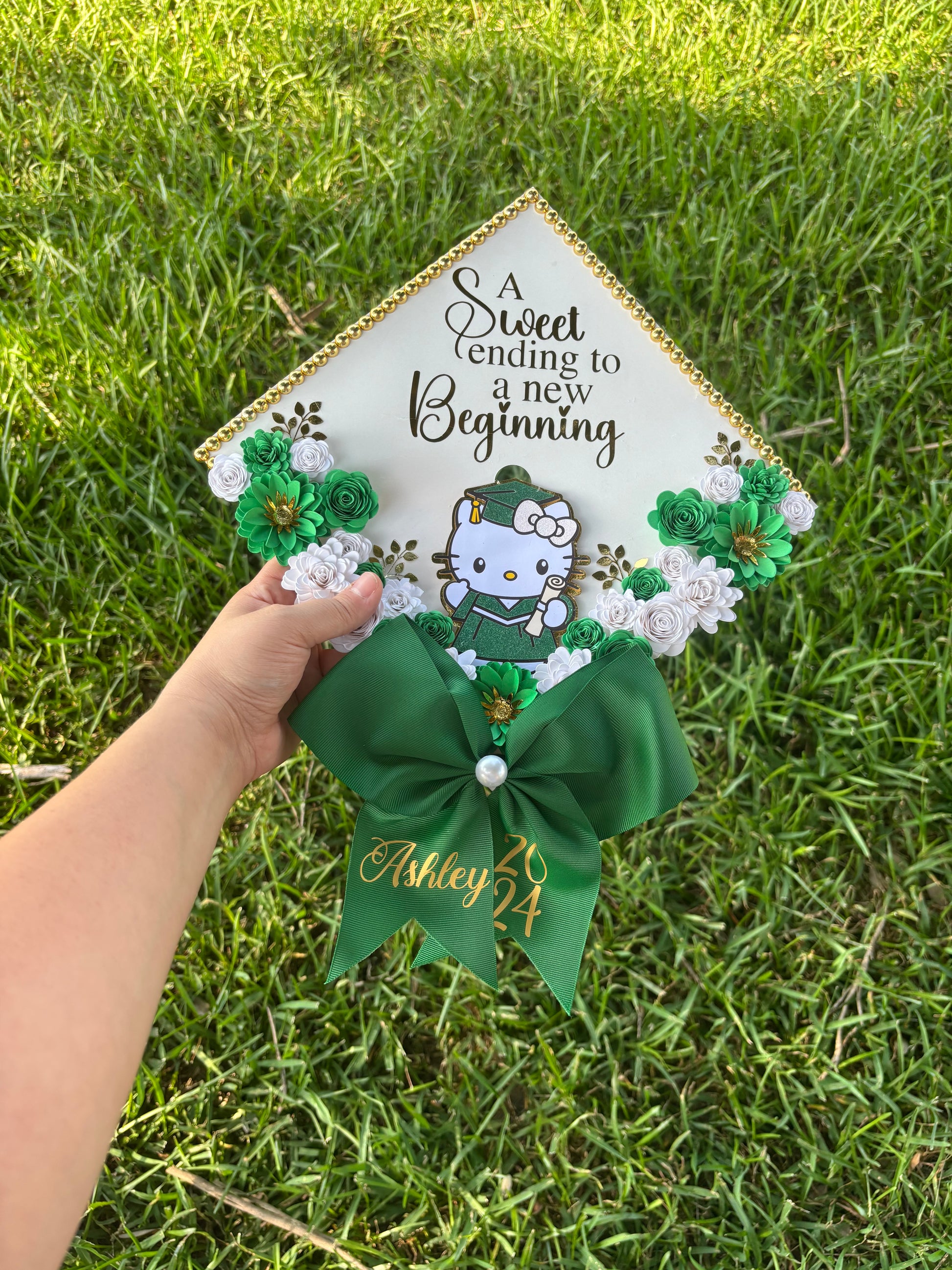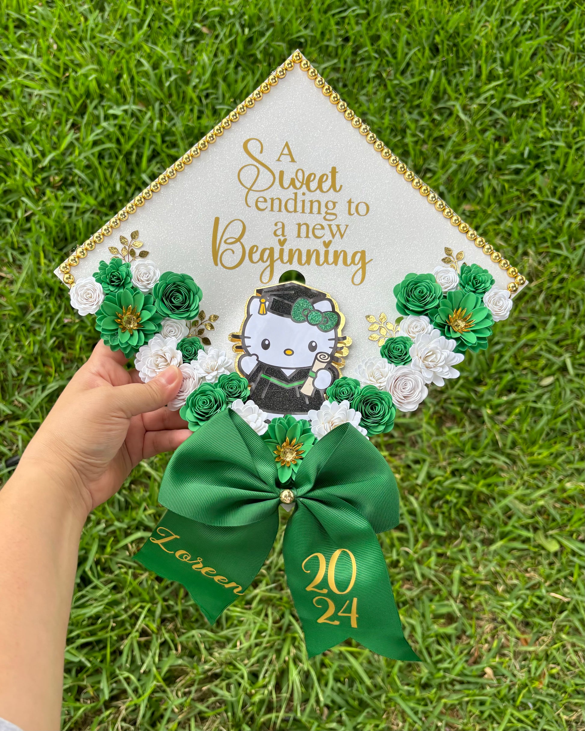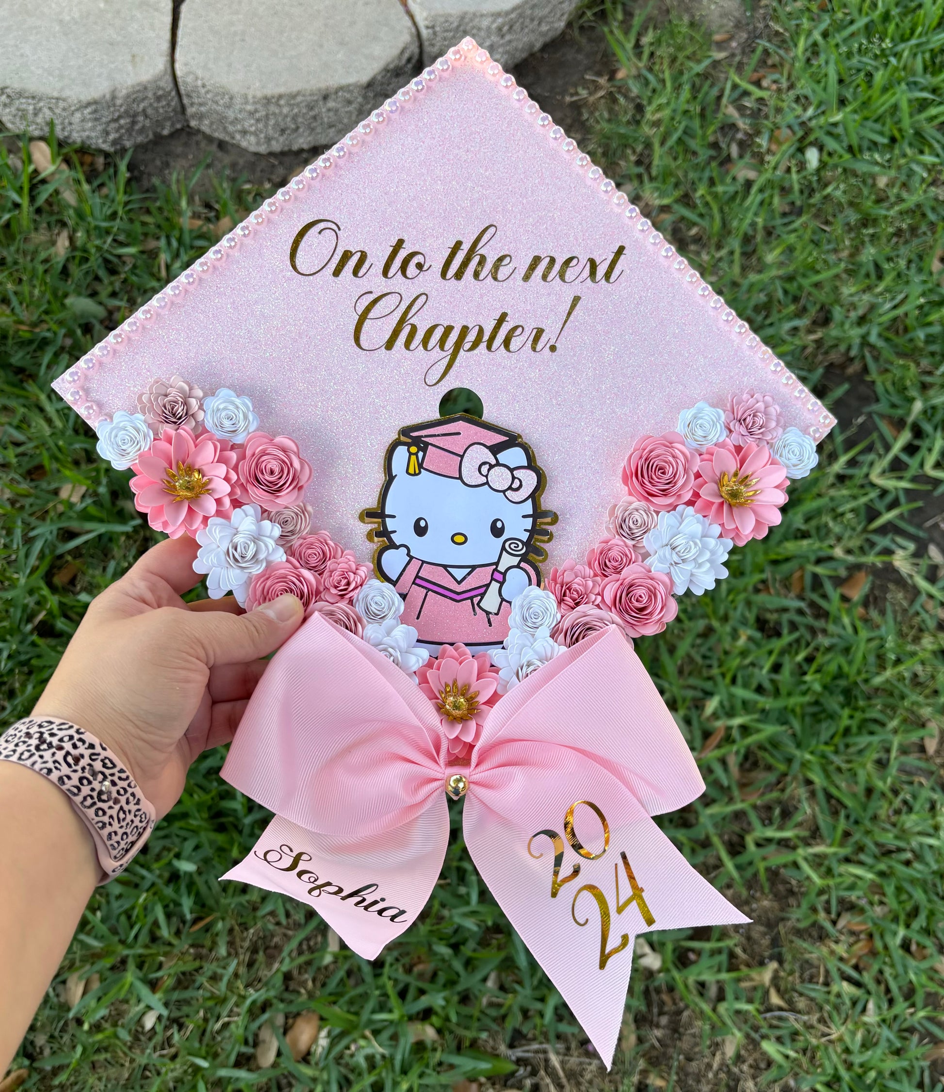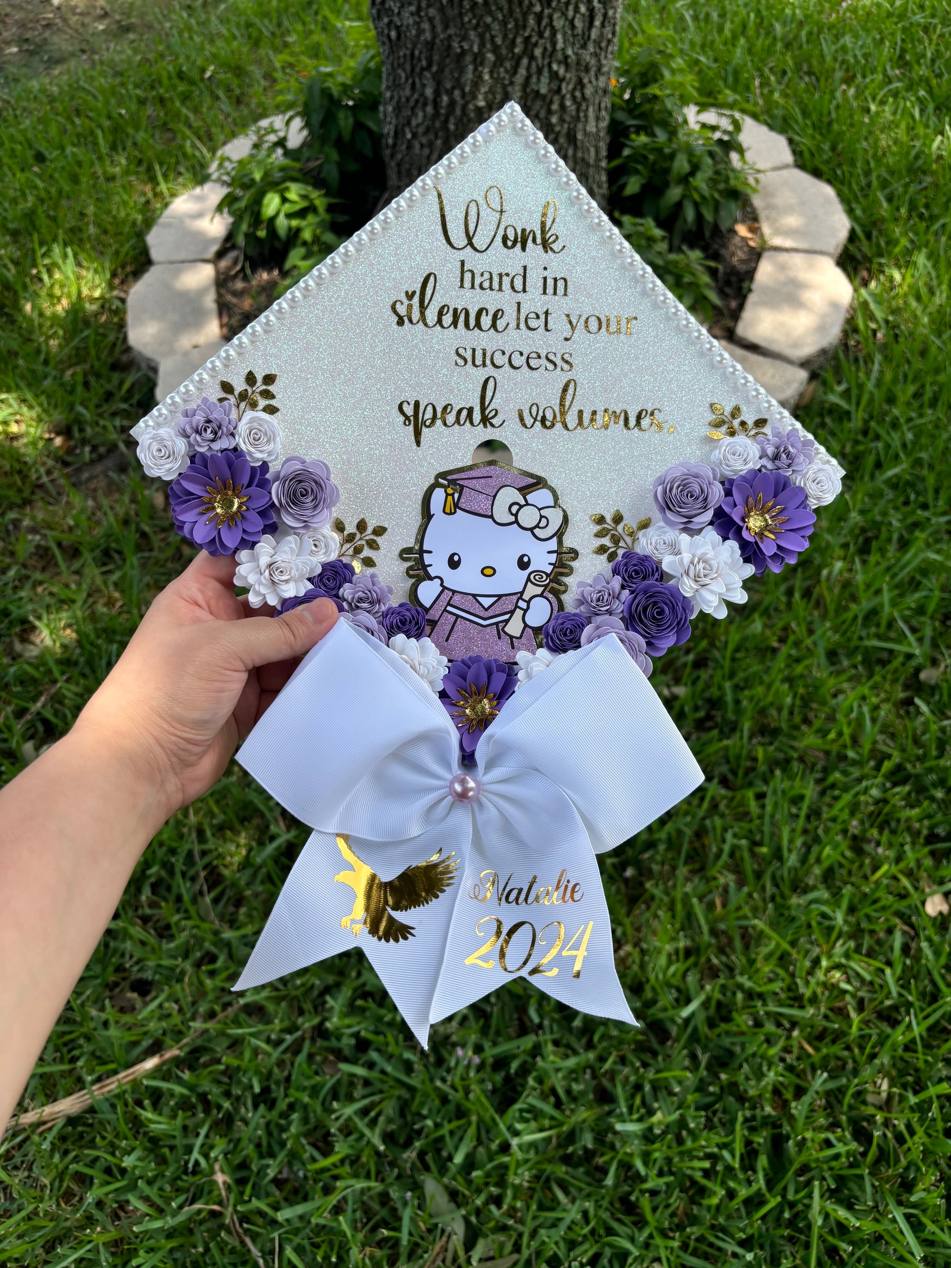 This is the perfect piece to customize your graduation,These topper includes ironed on vinyl and heavy glitter cardstock to insure the best quality for your grad cap topper. The flowers are handmade by me, the flowers are not sold individually and can not be found anywhere else, Making it even more special for your day.