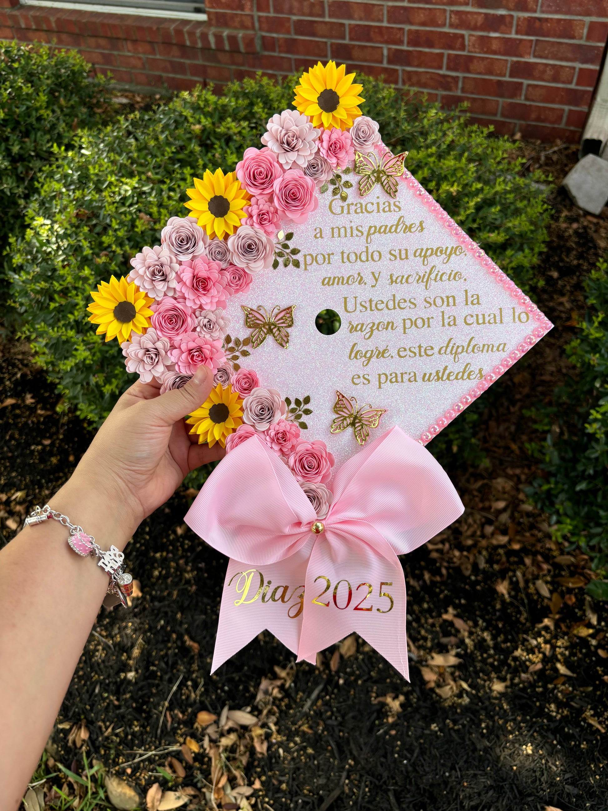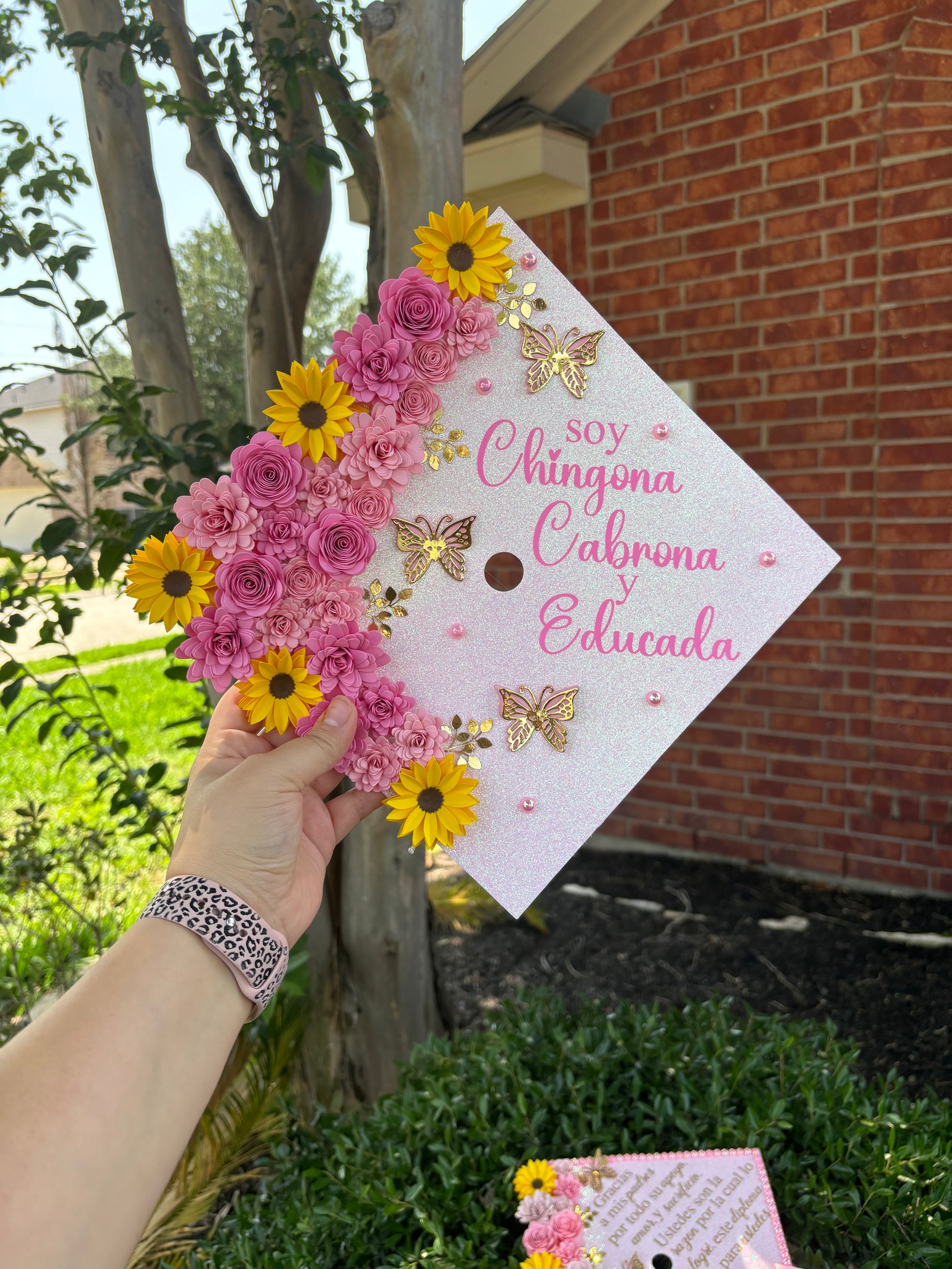 This is the perfect piece to customize your graduation,These topper includes ironed on vinyl and heavy glitter cardstock to insure the best quality for your grad cap topper. The flowers are handmade by me, the flowers are not sold individually and can not be found anywhere else, Making it even more special for your day.
